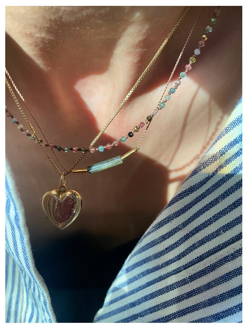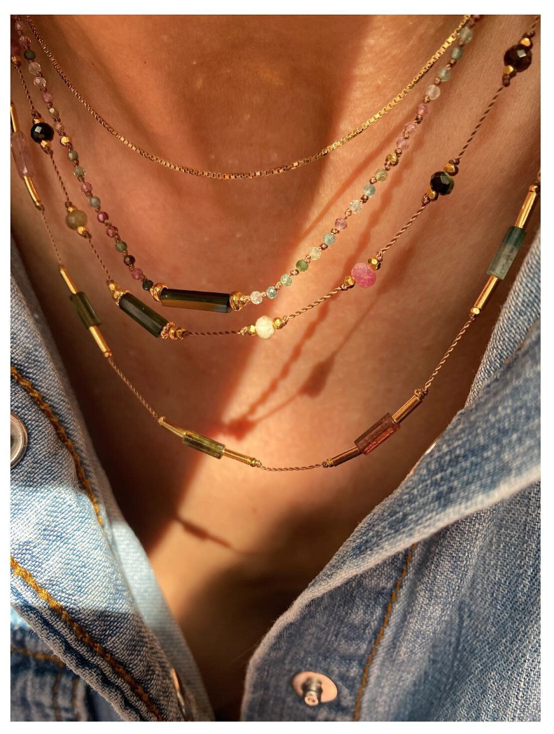 Collier Chance : Pierres tourmaline, bâton de tourmaline et perles en vermeil séparées par des petits noeuds.